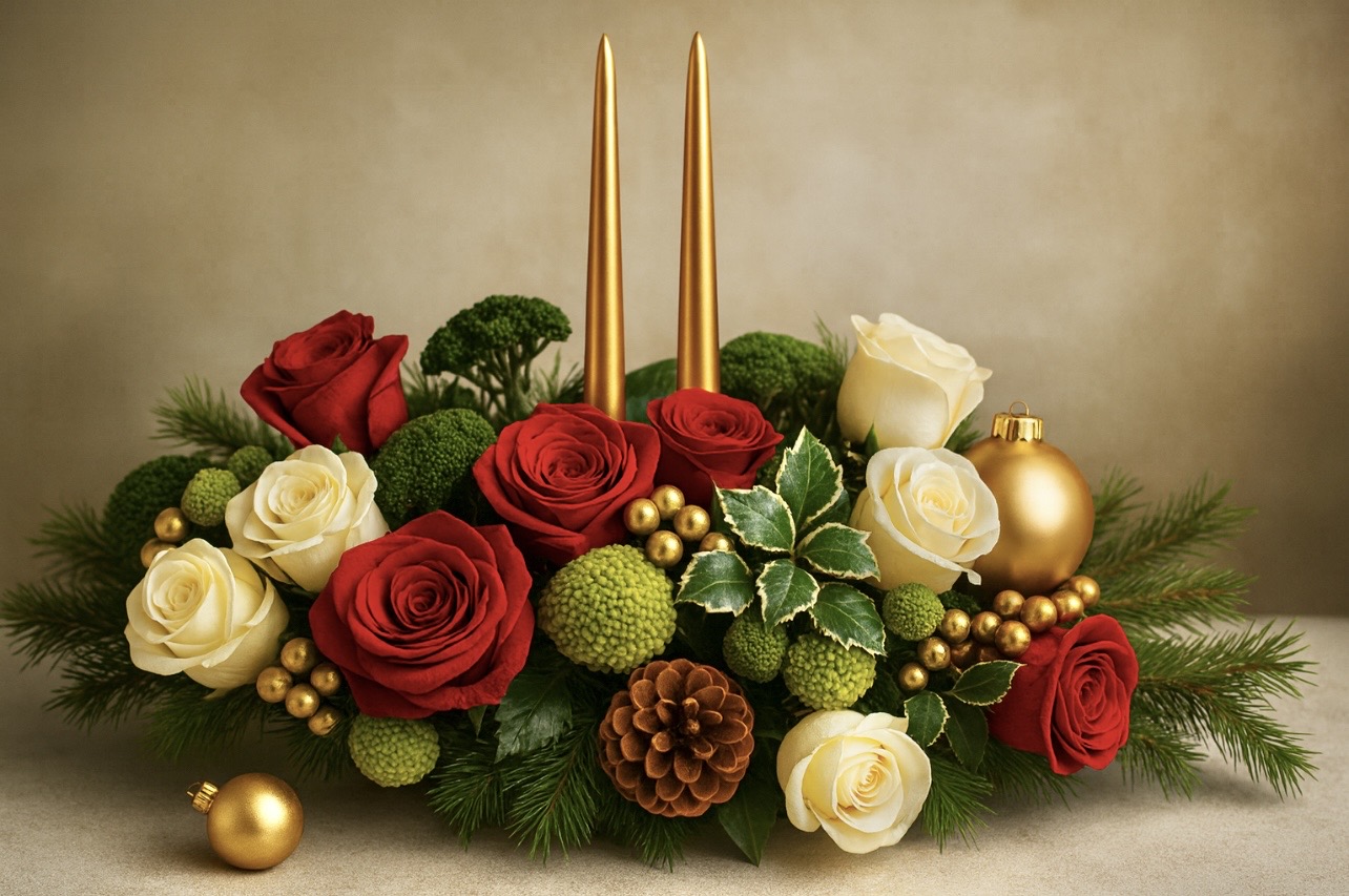 Deck the Halls Centerpiece. A masterful design that gives a striking creation of warmth and festive feel. Sophisticated beauty that is sure to please. Classic look that continues throughout the years. Dripless candles provided for the holiday spirit. We have everything featured in the picture in stock .